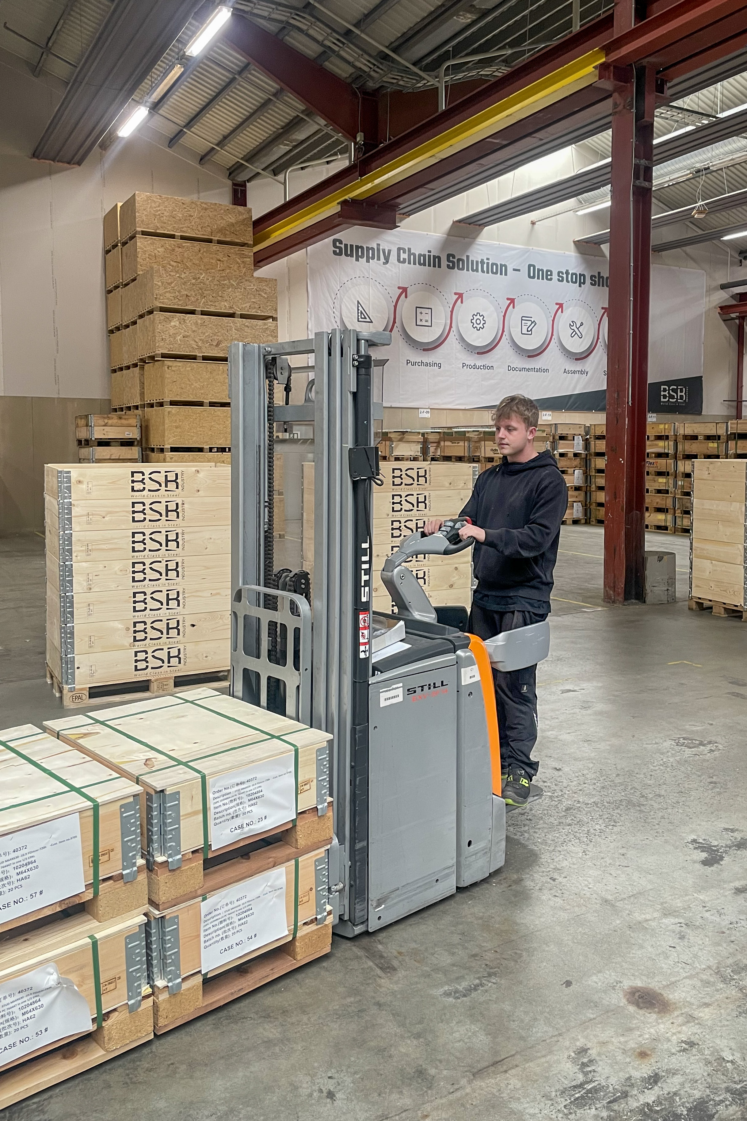 Szkolenie trwa 3 lata i 4 miesiące; obejmuje na przemian okresy nauki w EUC Syd w Aabenraa w południowej Jutlandii oraz zdobywanie praktycznych doświadczeń podczas pracy w BSB Industry. Przyszły praktykant na stanowisku operatora magazynowego i logistycznego jest wyraźnie podekscytowany możliwością poszerzenia swojej wiedzy oraz umiejętności.